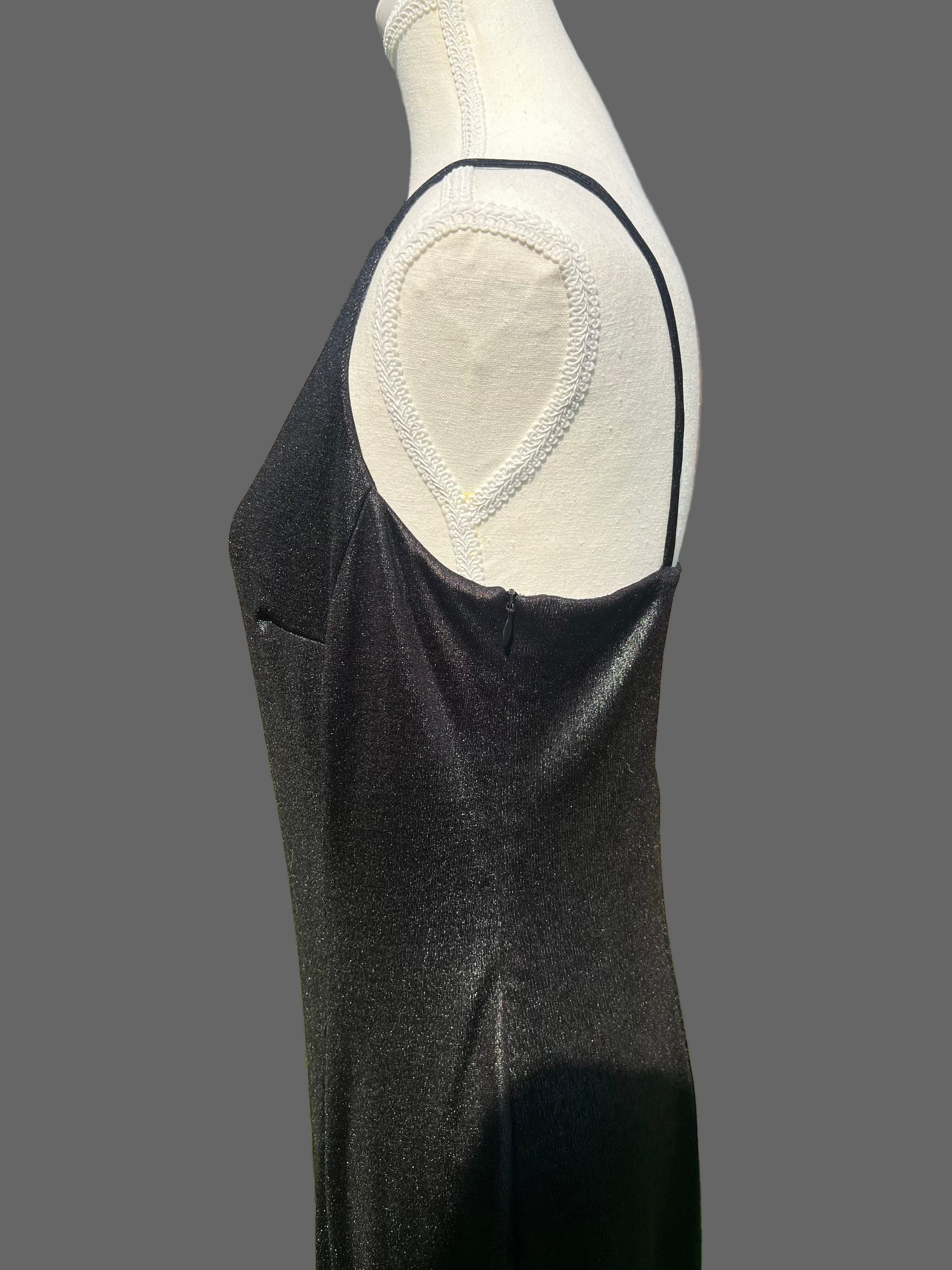 Step back into the glam of the '90s with this Alex Evenings Black Shimmer Gown. Its sparkling fabric catches the light just right, making you the star of any evening. Perfect for dancing the night away or turning heads at a classy event, this gown combines vintage charm with timeless elegance in one dazzling package.