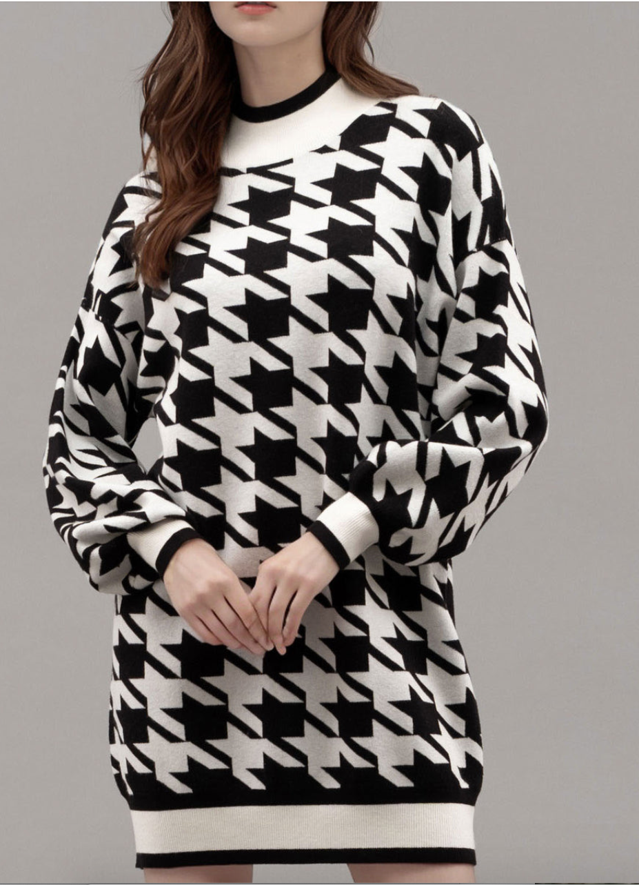Stay stylish and cozy with our Mock Neck Houndstooth Sweater Dress, a chic choice for any occasion. This trendy dress features a sophisticated mock neck that adds a touch of elegance, while the classic houndstooth pattern brings a timeless appeal to your WARDROBE. Crafted from soft, stretchy knit fabric providing all-day comfort. Versatile enough for the office or a casual outing. Pair it with ankle boots or heels to complete your outfit. Embrace warmth and style effortlessly with this must-have dress!