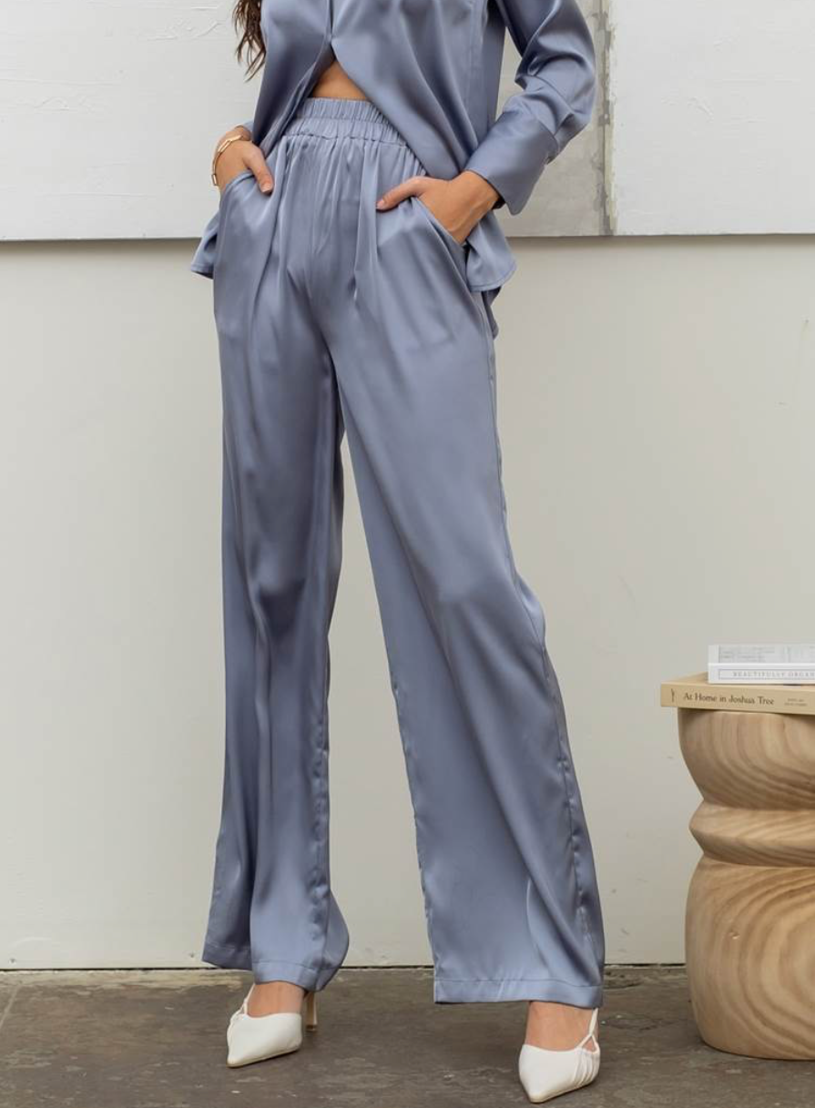Step into sophistication with our Solid Satin Wide Leg Pants in a rich blue hue. These luxurious pants feature a flowing wide-leg silhouette that exudes elegance and comfort, perfect for any occasion. Crafted from soft, satin fabric, they drape beautifully and add a touch of glamour to your WARDROBE. The high-waisted design flatters your figure, making them easy to pair with fitted tops or blouses. Dress them up with heels and statement jewelry for a night out, or keep it casual with a tucked-in tee for a chic day look. Elevate your style and embrace versatility with these stunning wide-leg pants!