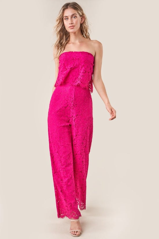 Make a breathtaking entrance in our Strapless Lace Jumpsuit in bright pink, a stunning blend of sophistication and allure. This exquisite jumpsuit features a delicate lace overlay that beautifully highlights your figure, while the strapless design showcases your shoulders for a touch of elegance. The tailored bodice and wide-leg pants create a flattering silhouette that’s perfect for special occasions or evening outings. Pair it with strappy heels and statement earrings for a head-turning look, or add a chic blazer for a more polished ensemble. Add femininity to your WARDROBE with this gorgeous jumpsuit!